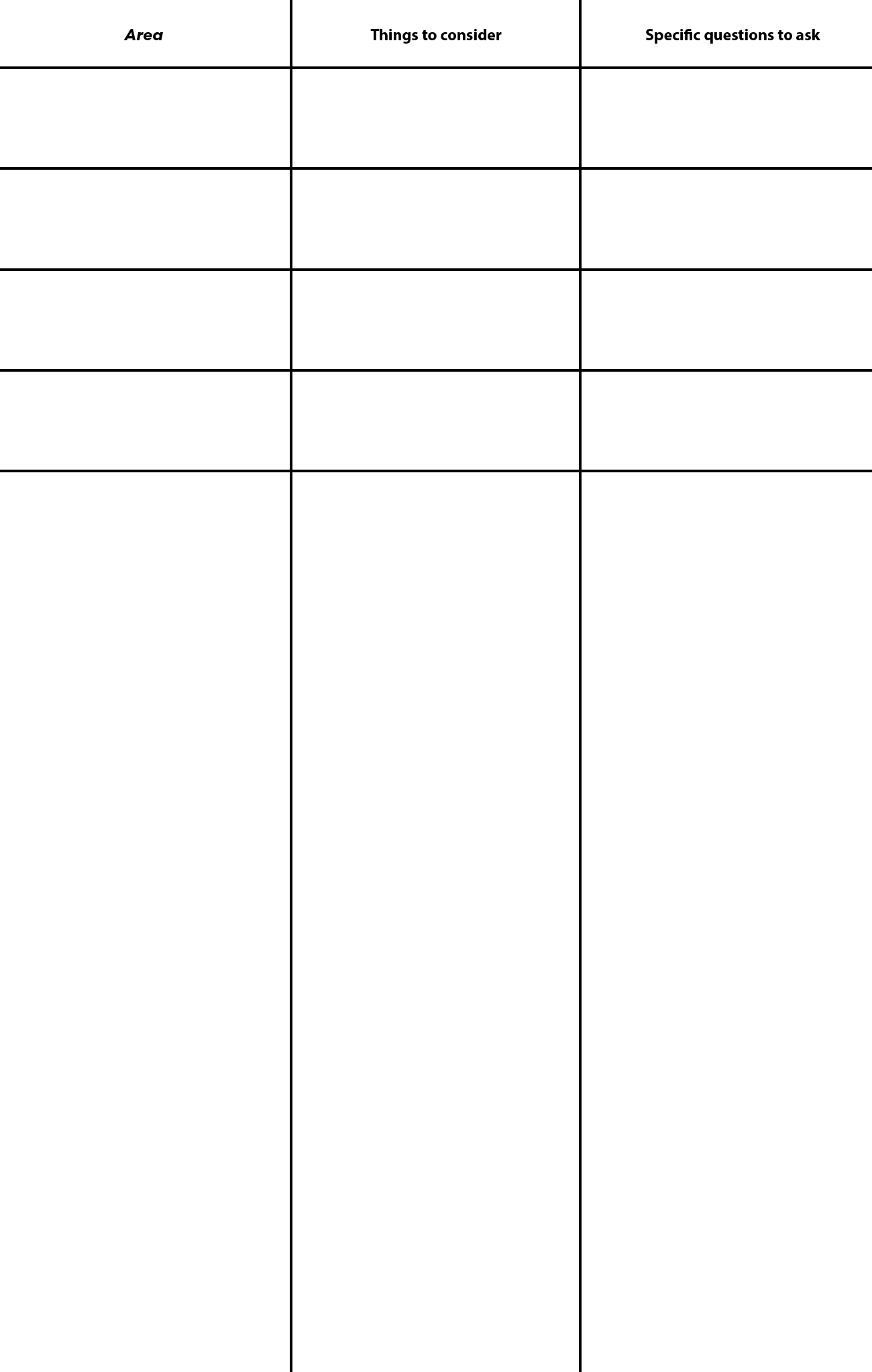 | Area | Things to consider | Specific questions to ask |