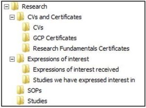 - Research file/folders: We would recommend that your practice begin a research file (electronic and/or paper). This could include GCP certificates and any other research related information, for example any interest you have expressed in specific studies, which will be useful if you apply for start-up or cluster funding at some point. Here is a suggested electronic file arrangement you may wish to create: